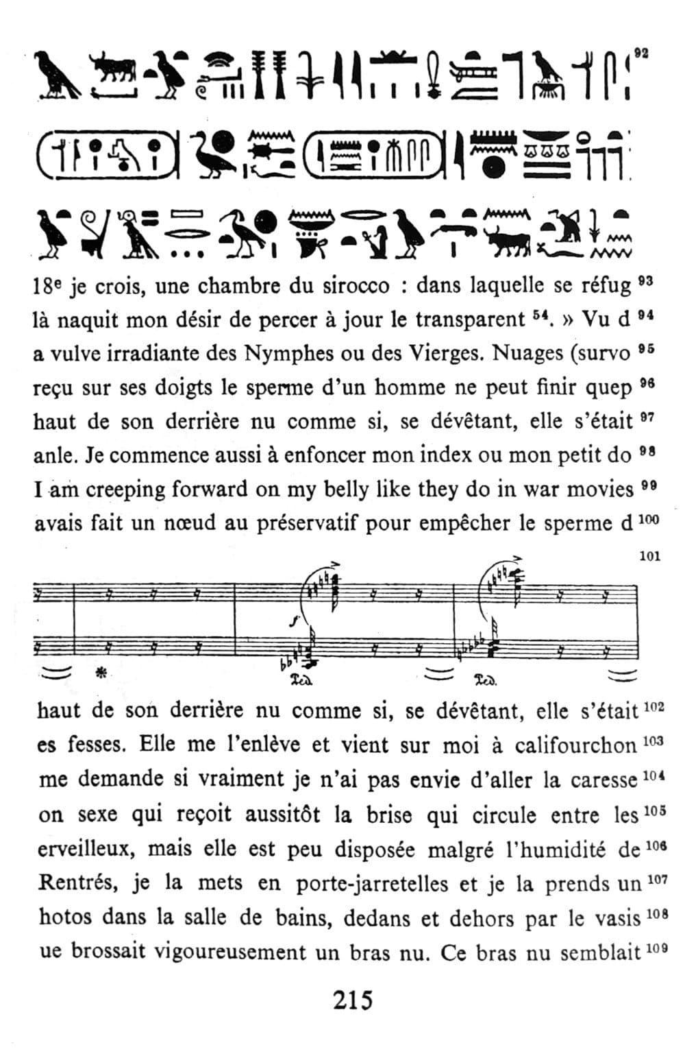 47Enfin, un enjeu majeur de l’avant-garde est de redonner au signifiant la primauté sur le signifié et sur le sens. Or la partition engage un autre type de lecture, moins accessible, non liée au sens. Pour un lecteur non musicien, ne sachant pas lire la musique ou n’étant pas capable de se faire une image auditive immédiate à la lecture d’une partition, la notation musicale peut aller jusqu’à jouer le rôle d’une langue étrangère dans un alphabet inconnu. Dans l’œuvre de Maurice Roche, par exemple, la notation musicale est associée à des mots écrits dans d’autres langues, dans des graphies extra-européennes (voir fig. 9) : elle y tient une place comparable à celle des glyphes mayas que le poète dissémine dans son « roman » CodeX. Dans Lois (1972, p. 37) de Philippe Sollers, par ailleurs, elle côtoie les idéogrammes chinois, nombreux dans le livre, et, sur les mêmes pages, l’italien et le mandarin en pinyin. Il y a donc bel et bien une proximité entre la notation musicale et les pratiques d’« hétérolinguisme » (voir Suchet, 2014) ; et cela, d’ailleurs, n’est pas l’apanage du corpus d’avant-garde, puisqu’une pratique semblable se retrouve chez Cingria, avec des langues comme le latin, le grec ou l’allemand. La partition pourrait en définitive représenter une variation sur l’idée proustienne, devenue un topos, de la littérature comme « une sorte de langue étrangère » (Proust, 1954, p. 361). On peut appliquer à la notation musicale dans les textes littéraires les outils d’analyse de Suchet (2014), qui, à propos des langues étrangères, définit un spectre allant du seuil de lisibilité au seuil de visibilité. Au-delà du seuil de lisibilité, la partition serait présente dans des notations complexes, difficilement déchiffrables, archaïques, et rien dans le paratexte n’aiderait à en créer une image sonore ; au-delà du seuil de visibilité, la notation se fondrait dans la langue rectrice du récit, par exemple avec le nom des notes en mention. On en a déjà vu un exemple chez Grégoire Bouillier, qui, avec ses « la si la sol fa# », met en place une stratégie de recréation mentale de la mélodie. On en trouve un autre exemple chez Pierre Guyotat : dans Le Livre (1984, p. 173), texte écrit « en langue », un français phonétiquement et syntaxiquement modifié pour accueillir en lui d’autres langues et répondre aux exigences de musicalité de l’écrivain, on lit « doudek aux deux demi doigts des deux māns tintant do do la si mi sol do ré ». La musique semble être rendue étrangère à elle-même. Les notes sont « déchiffrables », lisibles par leur nom, mais la musique en est absente : rien n’en indique ni la hauteur, ni le rythme, tandis que parallèlement le texte aspire à de plus en plus de musicalité. La « vraie » musique est réduite à l’a-mélodie, au silence, tandis que le livre s’émancipe de la page pour être mis en voix et enregistré par son auteur (voir Guyotat, [1979] 2017).