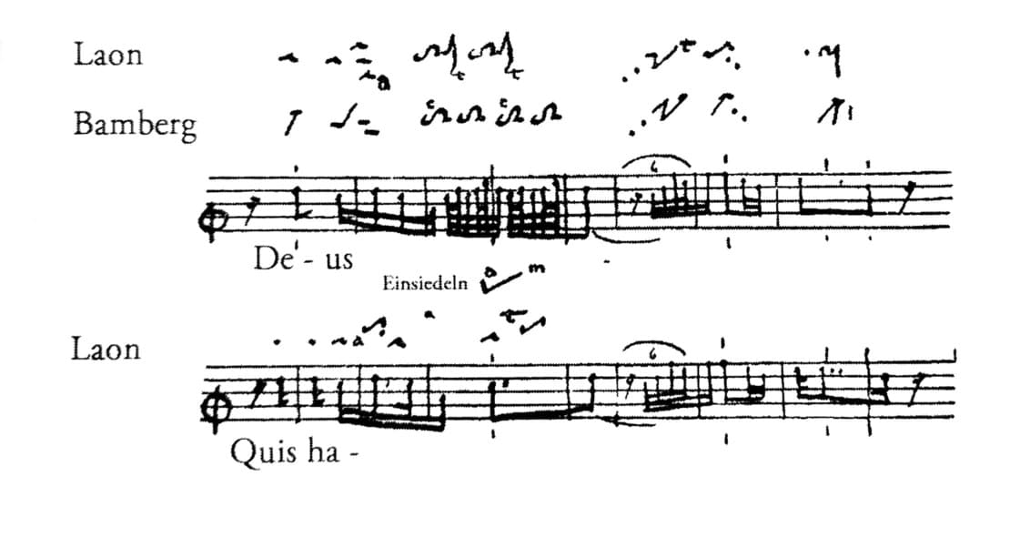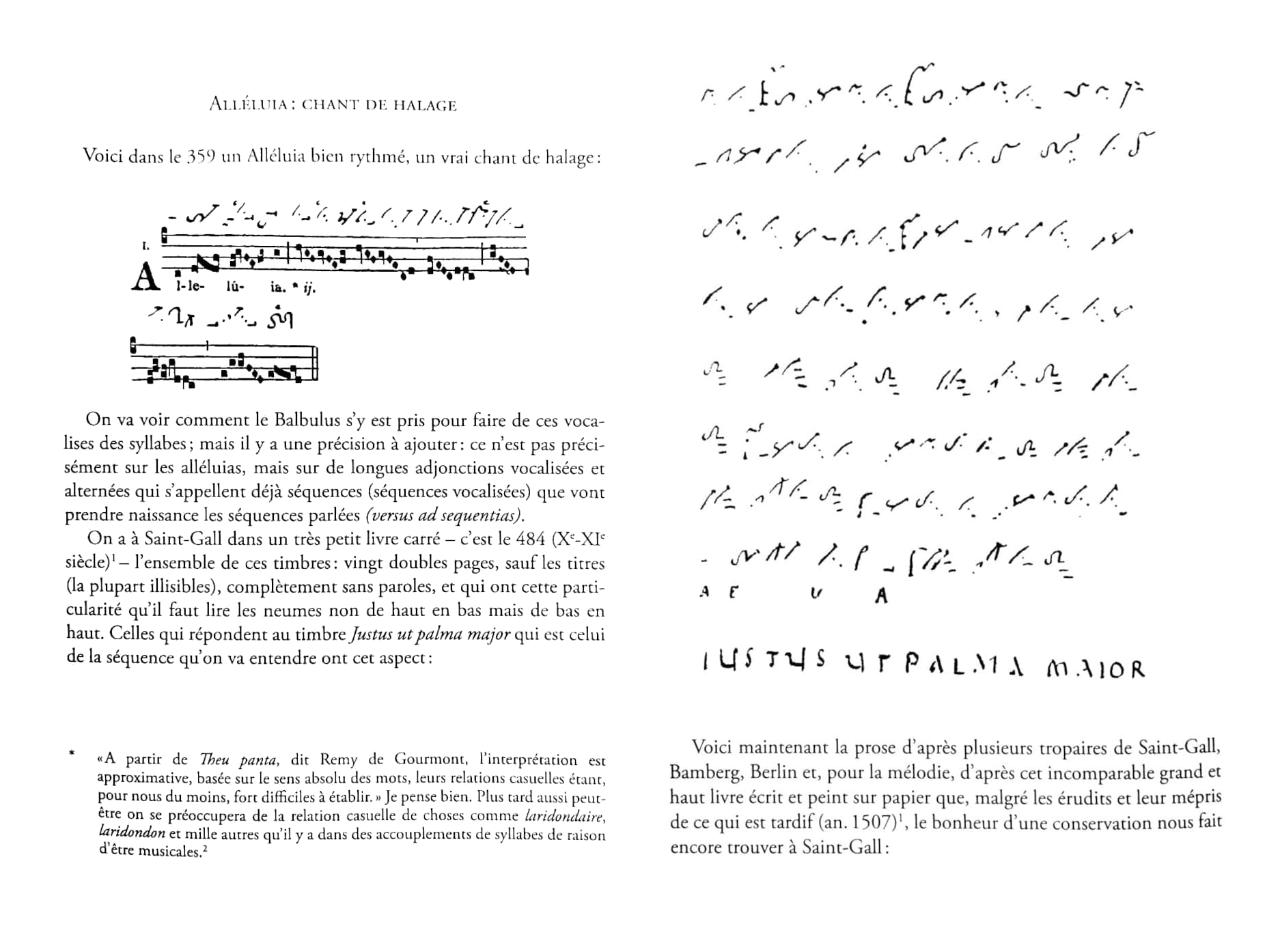 14Les textes de Charles-Albert Cingria, écrivain polyglotte et voyageur suisse romand, sont eux aussi truffés de partitions. Certains, comme La Civilisation de Saint-Gall ([1929] 2018), peuvent même être considérés comme des traités musicologiques. À partir d’un voyage dans le canton de Saint-Gall et d’une évocation de son abbaye, le récit de la vie de Gall est l’occasion pour Cingria de convoquer l’histoire d’un type de chant apparu vers le ixe siècle. Afin de « défendre le retour du rythme syncopé dans le plain-chant » (Schlaifer, 2017, p. 51), il insère de nombreux fragments de partitions grégoriennes, et en particulier des neumes (« symboles dessinés, plus ou moins mimétiques du trajet que doit suivre la voix dans les ornements chantés » – Schlaifer, 2017, p. 215 ; voir fig. 3-4).