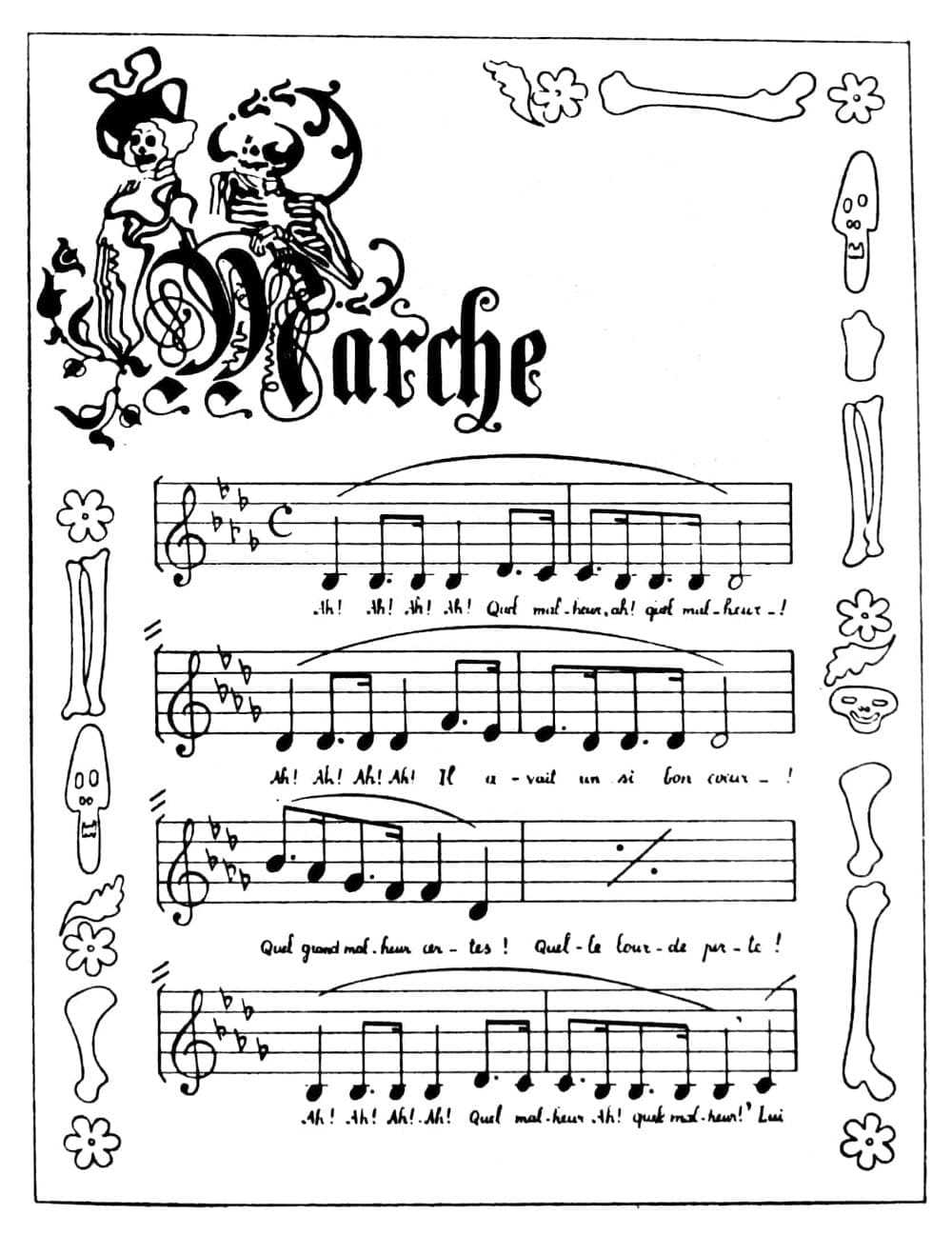 20La double page suivante (fig. 7-8) réécrit la Marche funèbre de Chopin en la simplifiant, en lui ajoutant des paroles naïves, et en l’illustrant de dessins floraux et mortuaires, sur le modèle du timbre ou des recueils de chansons anciens ou enfantins. La dérision et l’irrévérence s’expriment aussi par le registre sexuel : le squelette reposant au bas de la page 118 tient dans sa main gauche son phallus dressé.