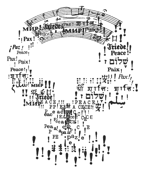 21Dans l’image suivante (fig. 9), qui peut s’apparenter à un calligramme, Maurice Roche organise sur la page, sous la forme d’une tête de mort, le mot « paix » dans différents alphabets, langues et graphies (on distingue du braille), ainsi que quelques mesures d’une partition prise en tant que matériau graphique pour dessiner le sommet du crâne (une cadence sur « in pace » que l’on retrouve d’ailleurs en leitmotiv obsédant dans ses différents livres).