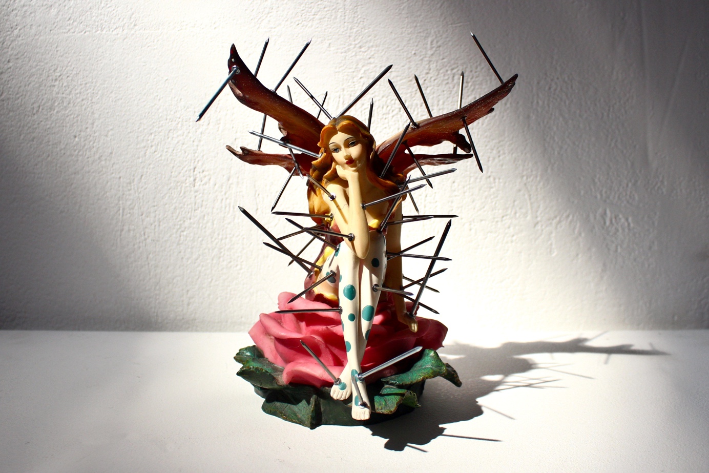 31Appartenant à la série des Objets magiques créée par l’artiste Gral en 2021, l’image photographique de la petite fée pensive que nous avons choisie pour illustrer ce dossier nous paraît résumer merveilleusement ses enjeux scientifiques. Sa posture méditative, les symboles qui l’accompagnent (la rose, les ailes et surtout les clous qui la traversent), les curieuses taches rondes sur ses jambes, évoquent à la fois le sens étymologique du mot « queer » (« oblique », « transversal »), son sens littéral (« bizarre », « bigarré ») et, plus largement, les tensions de la post-identité que les autres contributions n’ont eu de cesse d’explorer. C’est une image qui peut aussi indiquer l’ouverture des possibles offerte par les modifications corporelles, lorsque celles-ci parviennent à convertir la douleur en plaisir et le plaisir en fierté. Cette représentation, qui articule en son sein plusieurs catégories ontologiques (animal, végétal, autre, etc.), contient l’idée d’une violence que l’on retourne à l’envoyeur (les clous sont à l’envers). Avec son clair-obscur légèrement dramatique et baroque, cette fée exprime enfin l’urgence de faire advenir l’irréel ou le pas encore réel dans notre réalité de façon à pouvoir reconstituer, avec tout·e allié·e de bonne volonté, la texture d’un monde commun qui serait non seulement pensable mais surtout désirable.