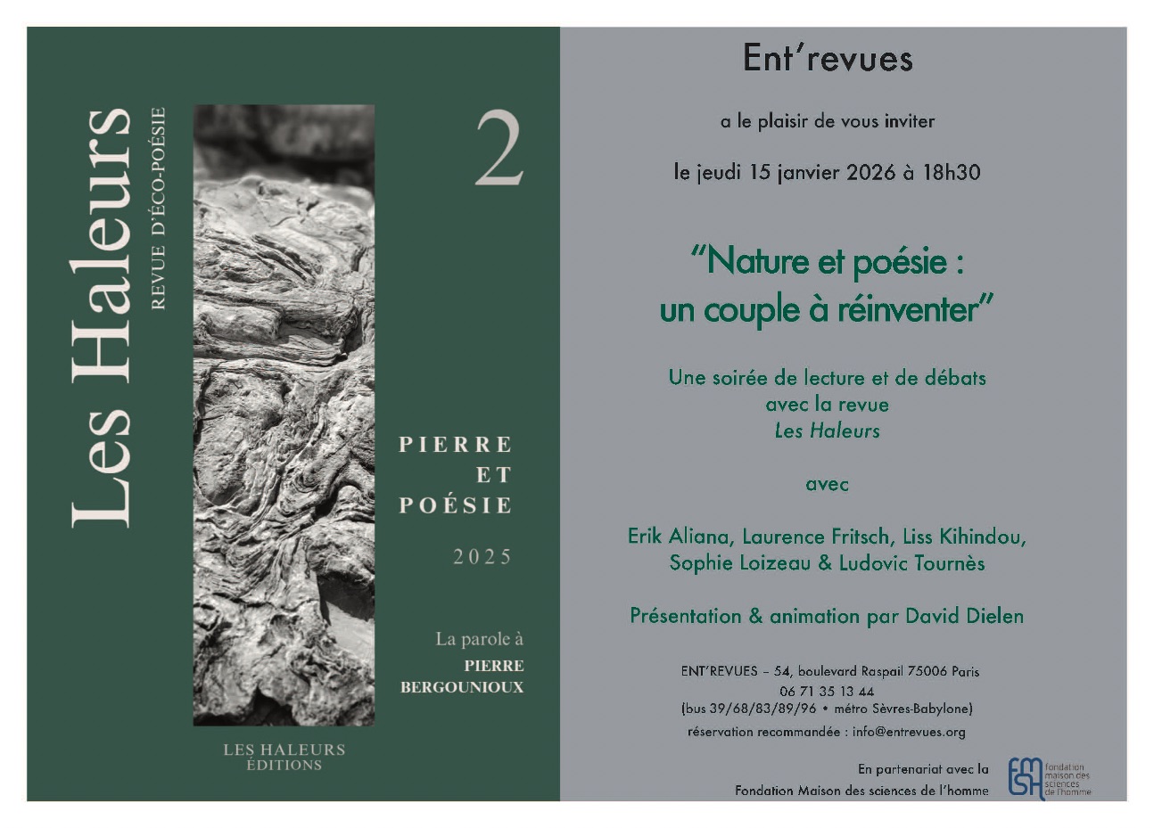 Pour la première rencontre de l'année 2026, Ent'revues reçoit la jeune revue Les Haleurs. JEUDI 15 JANVIER 2026 –  18h30 Autour de son animateur David Dielen, retrouvez l'équipe de la revue pour envisager et réinventer ensemble ce qui unit la nature et la poésie, la réalité du monde et le langage.  Une soirée avec Erik Aliana, Laurence Fritsch, Liss Kihindou,  Sophie Loizeau & Ludovic Tournès  Présentation et animation par David Dielen  — Ent'revues 54, boulevard Raspail75006 Paris Forum ...
