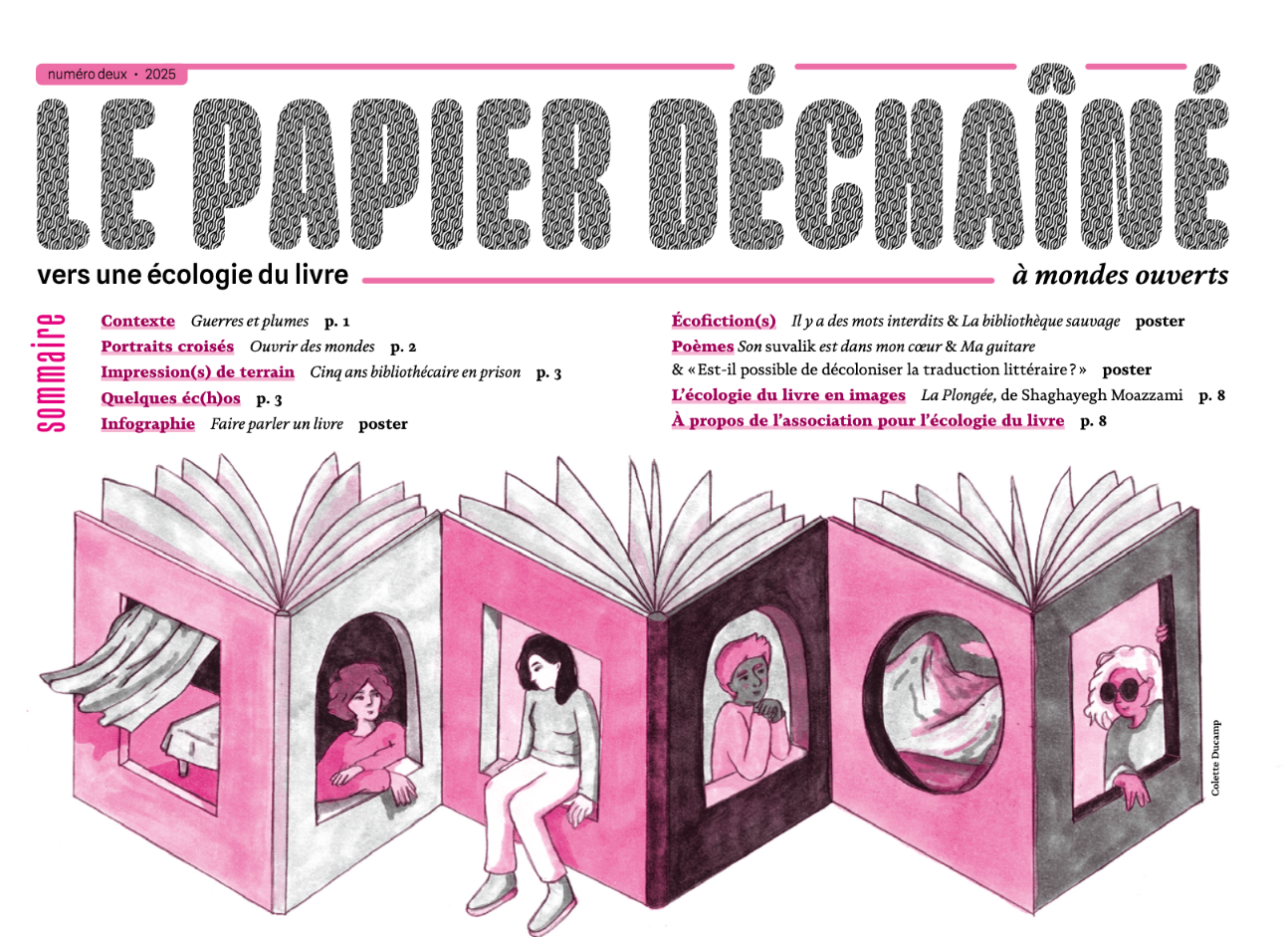 Annoncé par Actualitte.com : Le troisième numéro du Papier Déchaîné est sorti. Cet apériodique annuel de l’Association pour l’écologie du livre s’empare cette fois de la notion d’écologie symbolique, clôturant ainsi un cycle de réflexion consacré aux trois piliers de son action : l’écologie matérielle, l’écologie sociale et l’écologie symbolique. Après avoir exploré la chaîne du livre dans sa dimension physique et humaine, cette nouvelle parution s’aventure du côté de l’imaginaire, du langage...