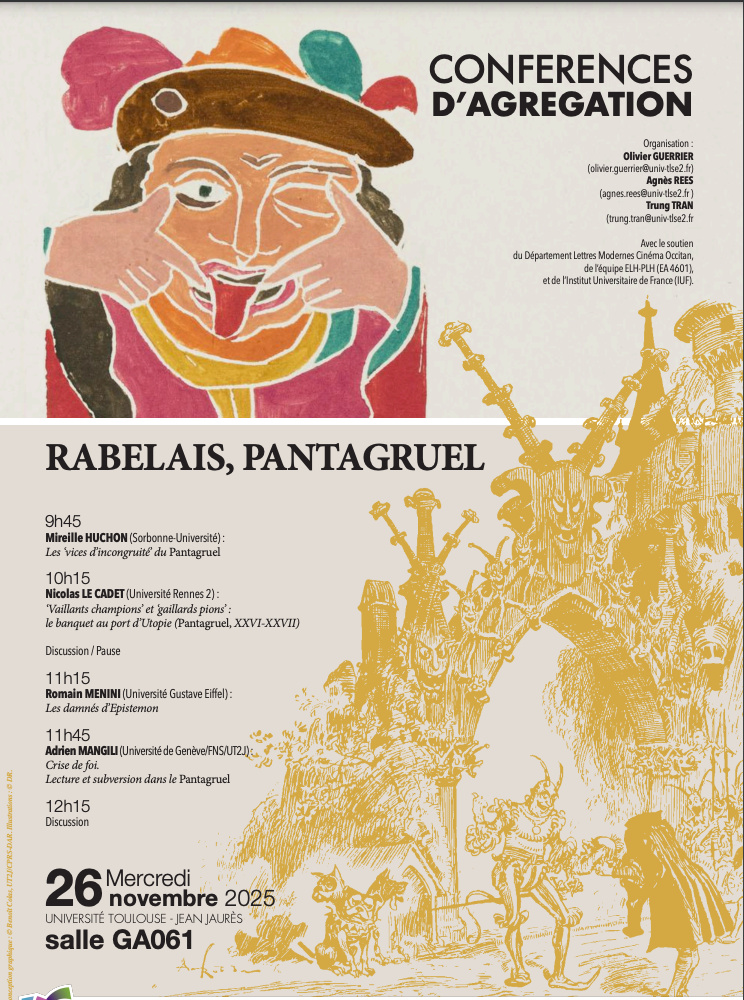 Conférences d’Agrégation – Rabelais, Pantagruel                                                   Mercredi 26 novembre 2025                                                   Le Gai savoir, Salle GA061 9h45-10h15 - Mireille Huchon (Université Paris Sorbonne) : « Les ‘vices d’incongruité’ du Pantagruel » 10h15-10h45 - Nicolas Le Cadet (Université de Rennes) : « ‘Vaillants champions’ et ‘gaillards pions’ : le banquet au port d’Utopie (Pantagruel, xxvi-xxvii) » 10h45-11h15 - Discussion / Pause 1...