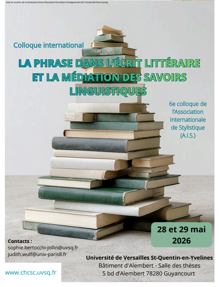 Colloque international « LA PHRASE DANS L’ÉCRIT LITTÉRAIRE ET LA MÉDIATION DES SAVOIRS LINGUISTIQUES » 6e colloque de l’Association Internationale de Stylistique (A.I.S.) 28 et 29 mai 2026 Centre d’Histoire Culturelle des Sociétés Contemporaines (CHCSC EA2448) Université Paris-Saclay (Université de Versailles Saint-Quentin-en-Yvelines) Salle des thèses 5 Bd d’Alembert 78280 Guyancourt Responsable : Sophie Jollin-Bertocchi — PROGRAMME JEUDI 28 MAI 9h Accueil 9h30 Allocutions de bienvenue 10h-1...