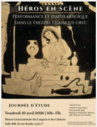 Journée d'étude Héros en scène : performance et statut héroïque dans le théâtre grec classique 10 avril 2026 Université Lyon 2, Maison Internationale des Langues et des Cultures (MILC), salle 308 Contact pour suivre la journée en ligne : charles.comminges@sorbonne-universite.fr — Programme  10h00 Accueil des participants 10h15 Introduction générale  Session 1 : Parole et silence : les langages de l'héroïsme Présidence : Pascale Brillet-Dubois (HiSoMA - Université Lyon 2) 10h30-11h15 : Cassand...