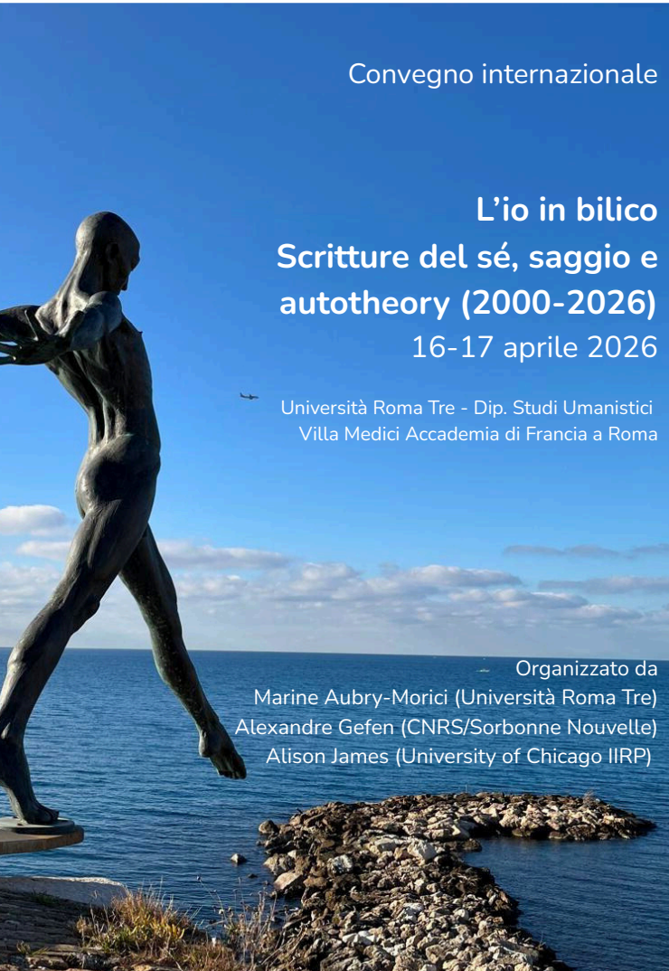 Colloque international L’io in bilico. Scritture del sé, saggio e autotheory (2000-2026) Le moi en question(s): Écritures de soi, essai autobiographique et autotheory (2000-2026) Organisé par Marine Aubry-Morici (Università Roma Tre, Dipartimento Studi Umanistici) Alexandre Gefen (CNRS/Sorbonne Nouvelle) et Alison James (University of Chicago- IIRP) Avec un débat entre Walter Siti et Alexandre Gefen, modéré par Daniele Giglioli Entrée libre sur réservation. Infos: marine.aubrymorici@uniroma3....