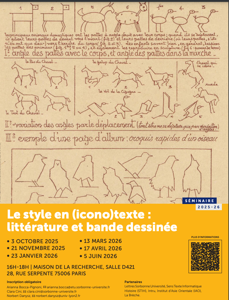 "Une certaine gêne à l'égard du canon" - Cinquième séance du séminaire de recherche "Le style en (icono)texte : littérature et bande dessinée" L'argumentaire général du séminaire est disponible ici. 17 avril 2026 - 16h-18h Maison de la Recherche, 28 rue Serpente (Paris), salle D421 : __ Matthieu Letourneux (Université Paris Nanterre) - “Peut-on imaginer une stylistique des formes sérielles ?” Cette communication se proposera de questionner l'idée d'un style en régime sériel qui se définirait...
