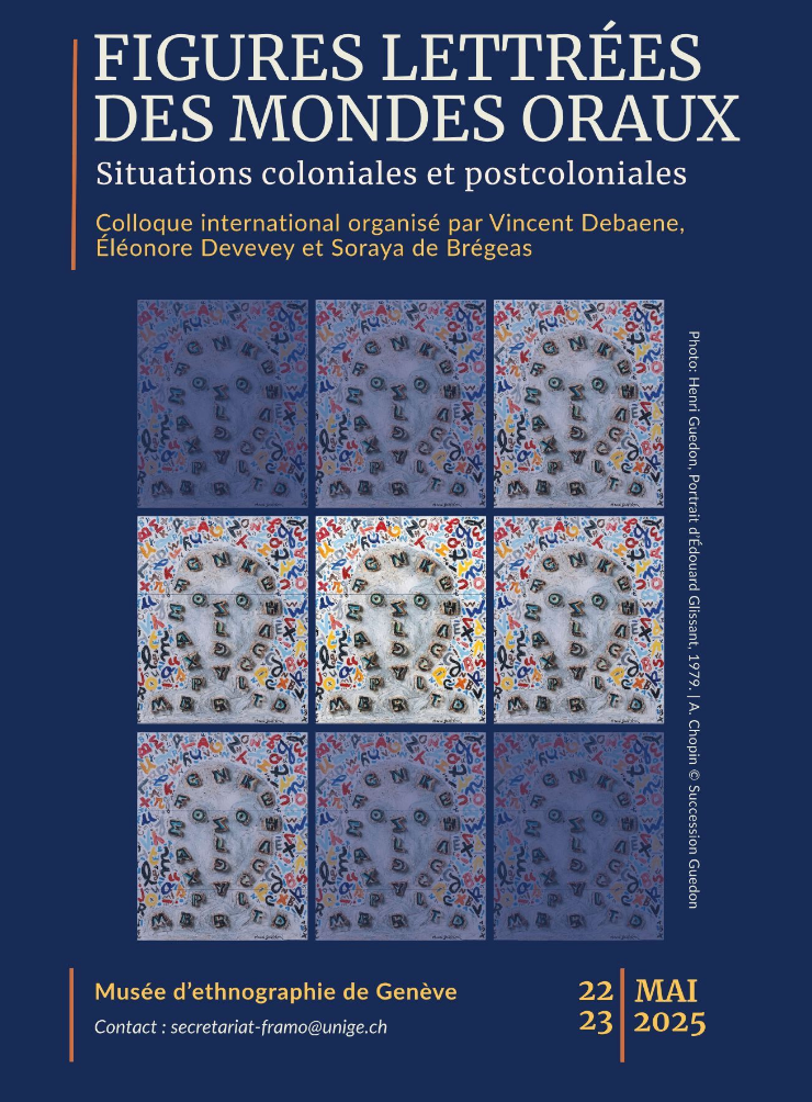 FIGURES LETTRÉES DES MONDES ORAUX. SITUATIONS COLONIALES ET POSTCOLONIALES Colloque international Musée d'ethnographie de Genève (MEG), 22 et 23 mai 2025 Organisé par Vincent Debaene, Éléonore Devevey et Soraya de Brégeas, en partenariat avec le MEG et à l’occasion de l’exposition Afrosonica – Paysages sonores, ce colloque marque le dernier temps d’une réflexion collective menée dans le cadre du projet FNS « La parole "indigène" entre littérature orale et culture lettrée » (2022-2026). La dom...