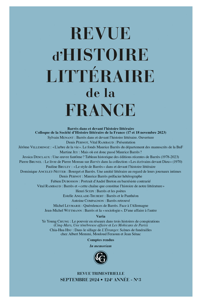 Revue d'Histoire littéraire de la France, 2024, n° 3 : "Barrès devant l'histoire littéraire" (D. Pernot & V. Rambaud dir.)