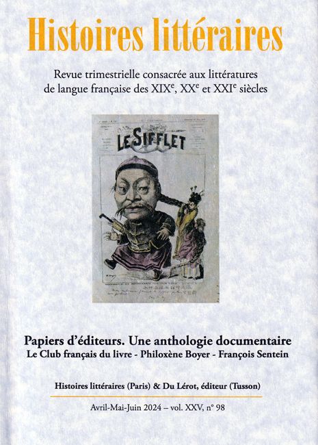 Histoires Littéraires, n° 98 / avril-mai-juin 2024 Éditorial… Gilles Picq : Le Chinois de Théophile ou l’ethnocentrisme des gens de lettres au temps de Ferry-Tonkin Les Loisirs de la Poste : Une lettre inédite de Philoxène Boyer à Charles Asselineau par Jean-Clément Martin-Borella Papiers d’éditeurs. Une anthologie documentaire Dossier préparé et présenté par Anthony Glinoer & David Martens Victor Hugo : de figure patrimoniale à source de création contemporaine.Entretien avec Inga Walc et...