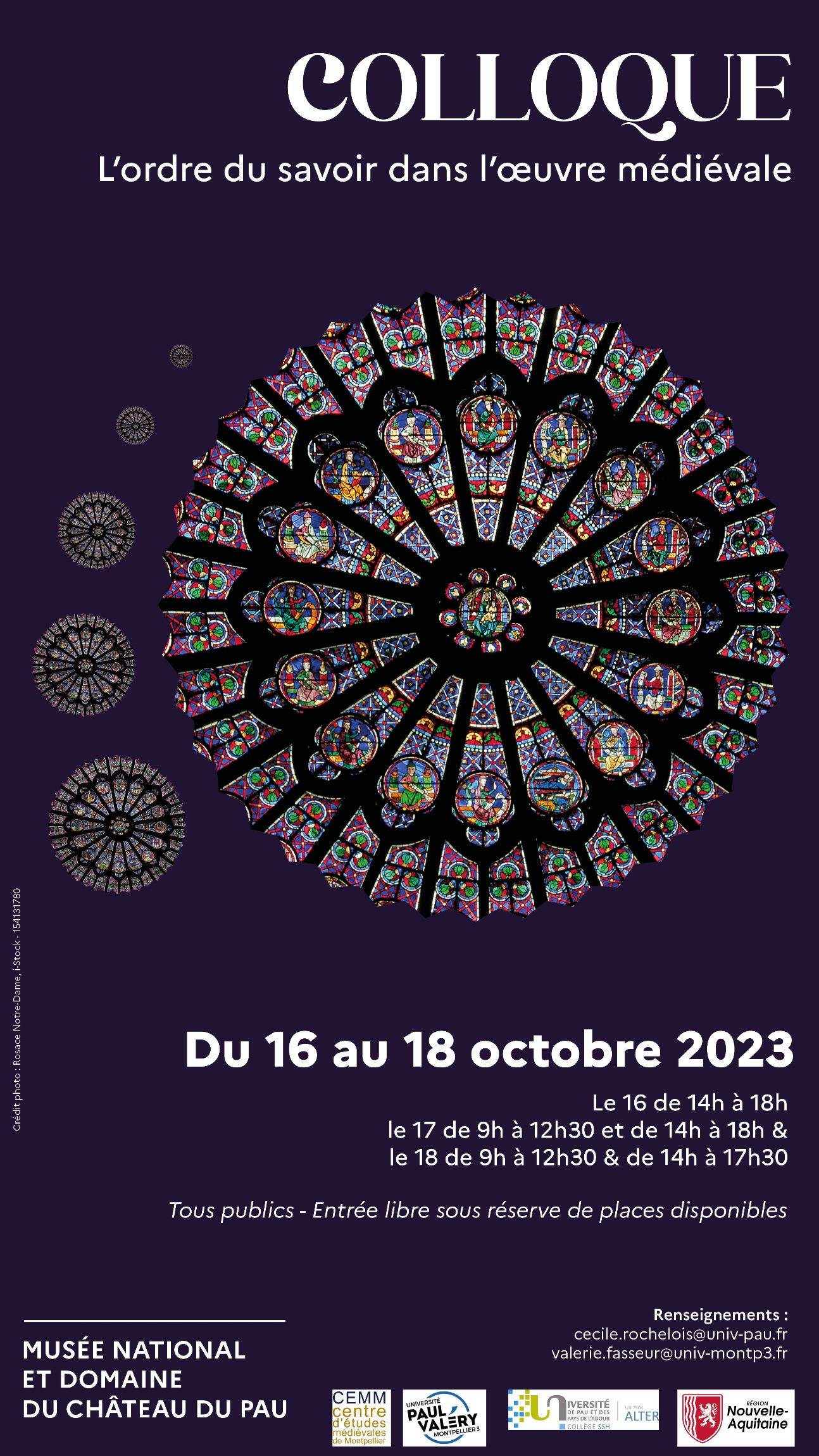 Le colloque « L'ordre du savoir dans l'œuvre médiévale » se tiendra à Pau du 16 au 18 octobre 2023. Il est organisé par le laboratoire ALTER (Arts/Langages. Transitions & Relations) de l’Université de Pau et des Pays de l’Adour, et le CEMM (Centre d’études médiévales de Montpellier) de l’Université Paul-Valéry Montpellier 3, en partenariat avec le Musée national et domaine du château de Pau. Ce colloque porte sur l’étude de l’inclusion d’un savoir dans une œuvre littéraire médiévale, qui ...